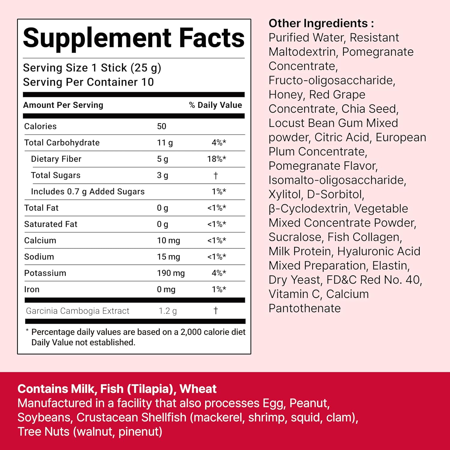 Digestion-resistant Maltodextrin (corn (Russia, Hungary, Serbia, etc.)}, Garcinia cambogia extract (India), water, pomegranate concentrate (Spain), fructooligosaccharide, fermented honey (domestic), red grape concentrate, chia seeds ,Locust bean gum mixed powder, citric acid, lactulose, prune concentrate, pomegranate flavor (fragrance), isomaltooligosaccharide, xylitol, D-sorbitol solution, B-cyclodextrin, carmine mixture (carmine preparation (dextrin, carmine), dextrin, Gardenia red pigment), mixed vegetable powder, sucralose (sweetener), fish collagen, milk protein concentrated powder, hyaluronic acid mixture (dextrin, hyaluronic acid), elastin extract mixture powder, dried yeast, vitamin C, calcium pantothenate